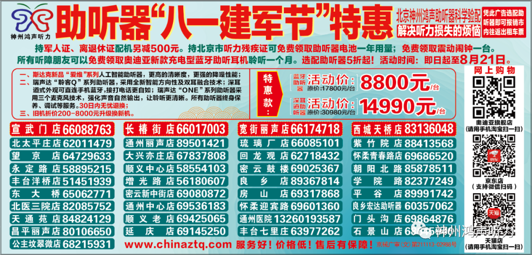 持军人证、离退休证配机另减500元。持北京市听力残疾证证可免费领取助听器电池一年用量;免费领取震动闹钟一台。所有听障朋友可以免费领取奥迪亚新款充电型蓝牙助听耳机聆听一个月。选配助听器5折起!活动时间:即日起至8月21日。